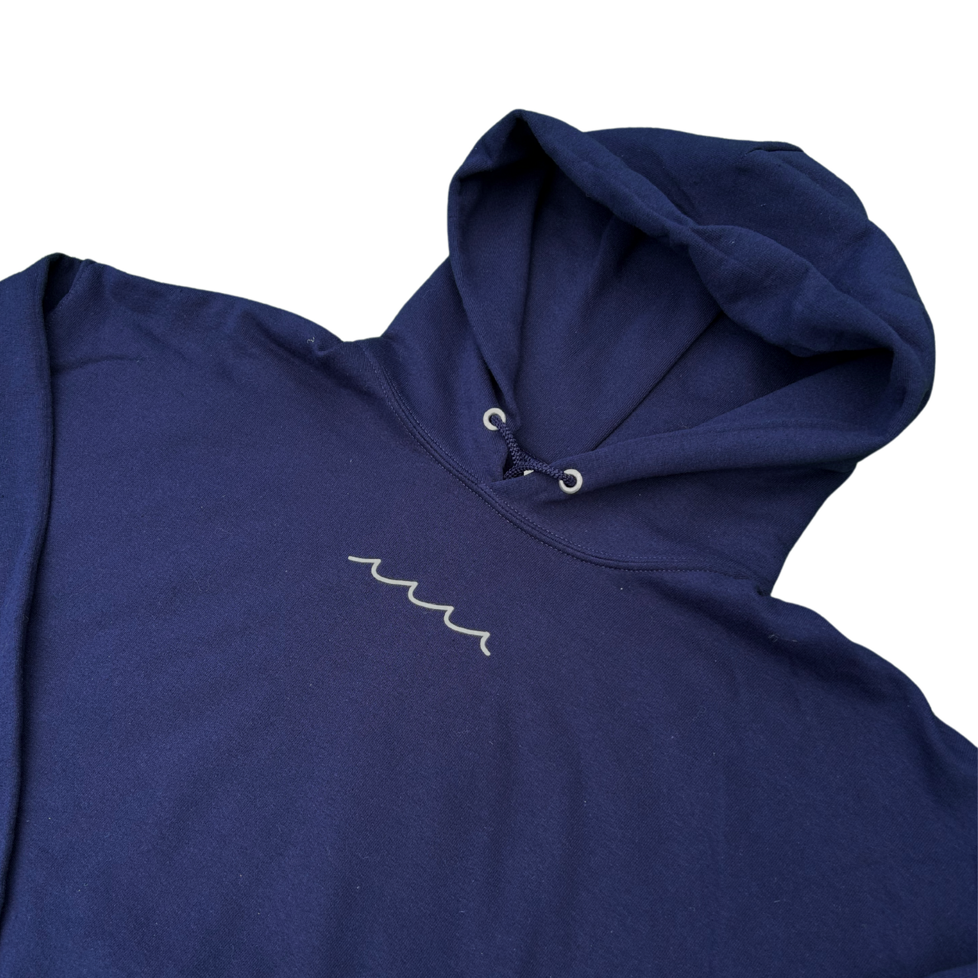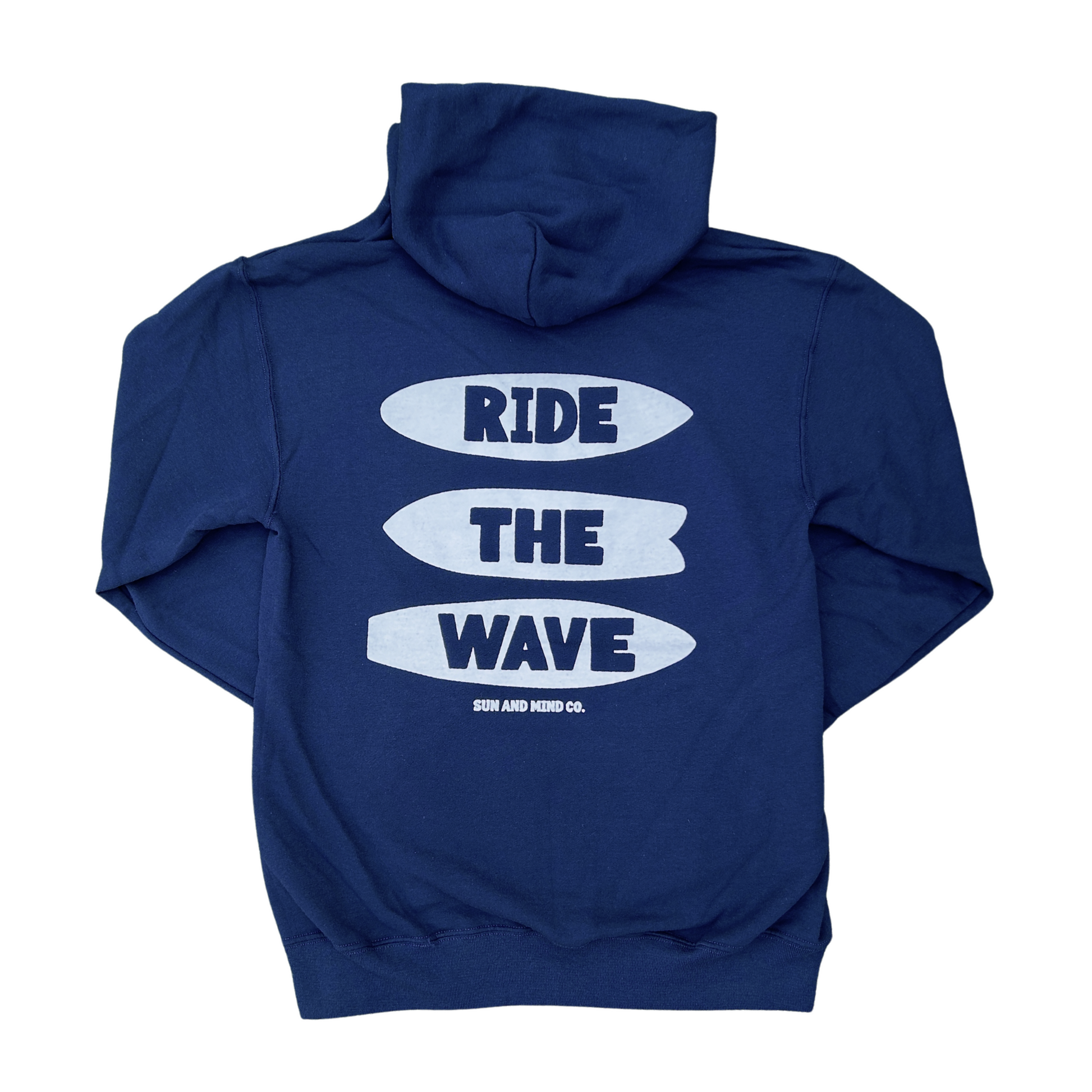 - navy blue hoodie with "RIDE THE WAVE" shown in three vertically stacked surfboards
